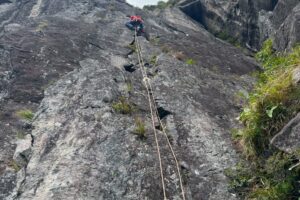 ポコポコ岩が引っ掛かりやすいので短く切ってロープ1本で降りる。