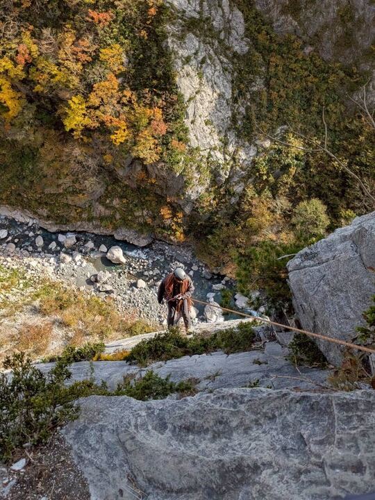 懸垂下降での事故が非常に多いことも再確認しあい、お互いでの慎重なチェックや意思疎通何度も行いながら下降。事前にあたりを付けていた複数の下降ラインから最も無難に降りられると判断できたルートを、劣化している終了点を適宜ハーケン等打ち足し補強しつつ取付まで戻りました。