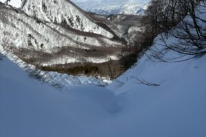 先に登った方々が「雪が重くて💦」とトレースをそのまま引き返してくる中、雪崩リスクポイントを避けさらに奥へ… からの一気に腰パウ滑走〜⛷️⛷️⛷️✨
