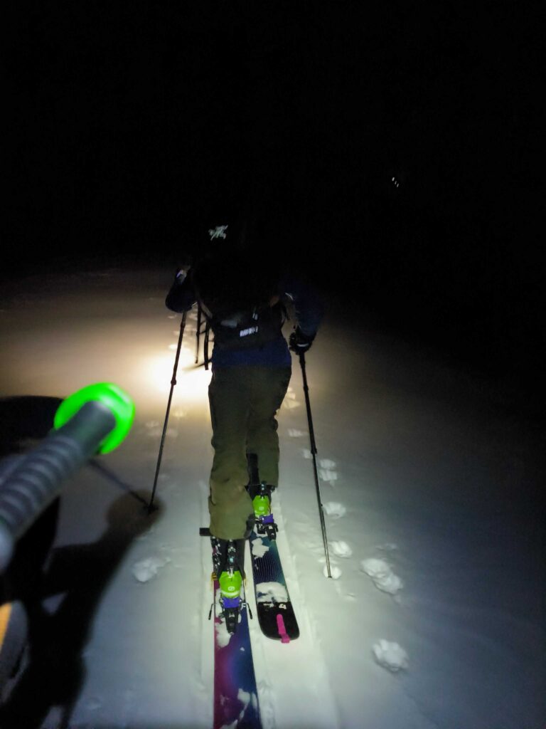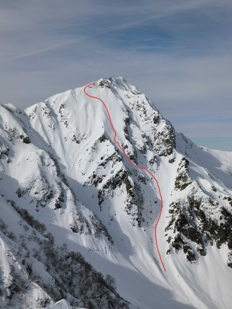 ドロップ地点に立つと45度くらいの見慣れた斜度だが、シーズンイン直後のスティープという事もあり少し緊張する。1番手でkhanhが滑り出しフェイスの雪に苦戦しているのが見える。ややモナカコンディションのようだ。一方、沢は快適に滑っており期待が高まる。