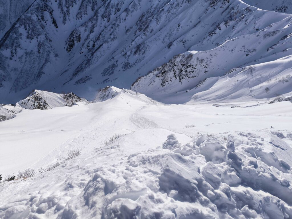 昨日の不安定性を踏まえ雪庇を落とすことにし、二人でスコップを1突き。すると幅10mの雪庇がボコンと落ち、なかなか爽快な光景だった。雪庇の落ちる様を見ていたが、昨日の不安定性は解消しているようだ。滑走準備を整える。