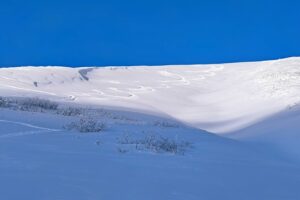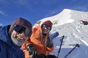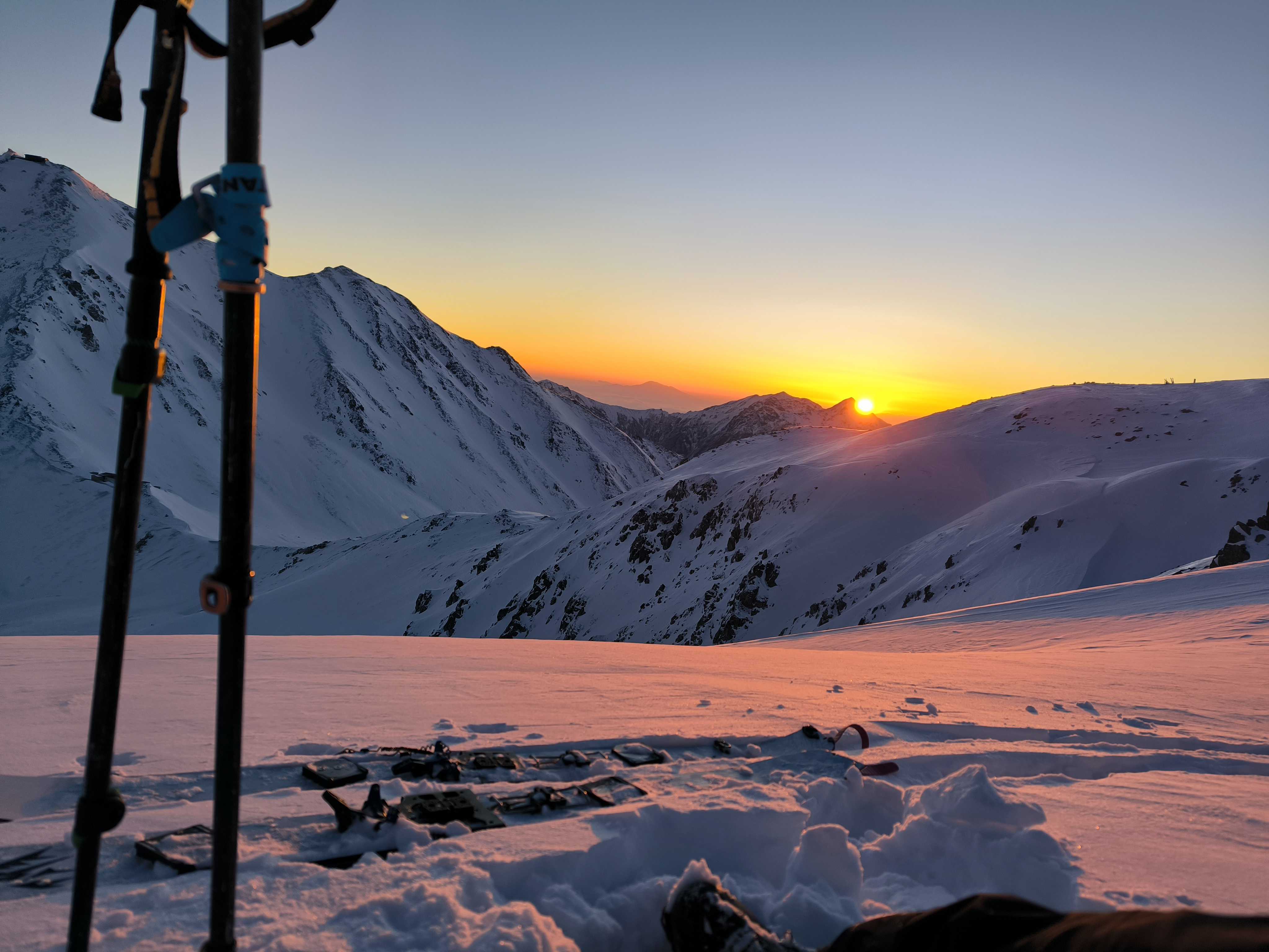 途中駅に幕営装備をデポし浄土山を登り、朝日を見つつ滑走準備をした。パウダーを期待し、浄土山ボウルを滑るもやや風で叩かれており拍子抜けだった。その後、登返し龍王岳のコルを滑ると、こちらの雪はパウダーで楽しく、風を読む力が足りないなぁと思わずボヤいた笑。