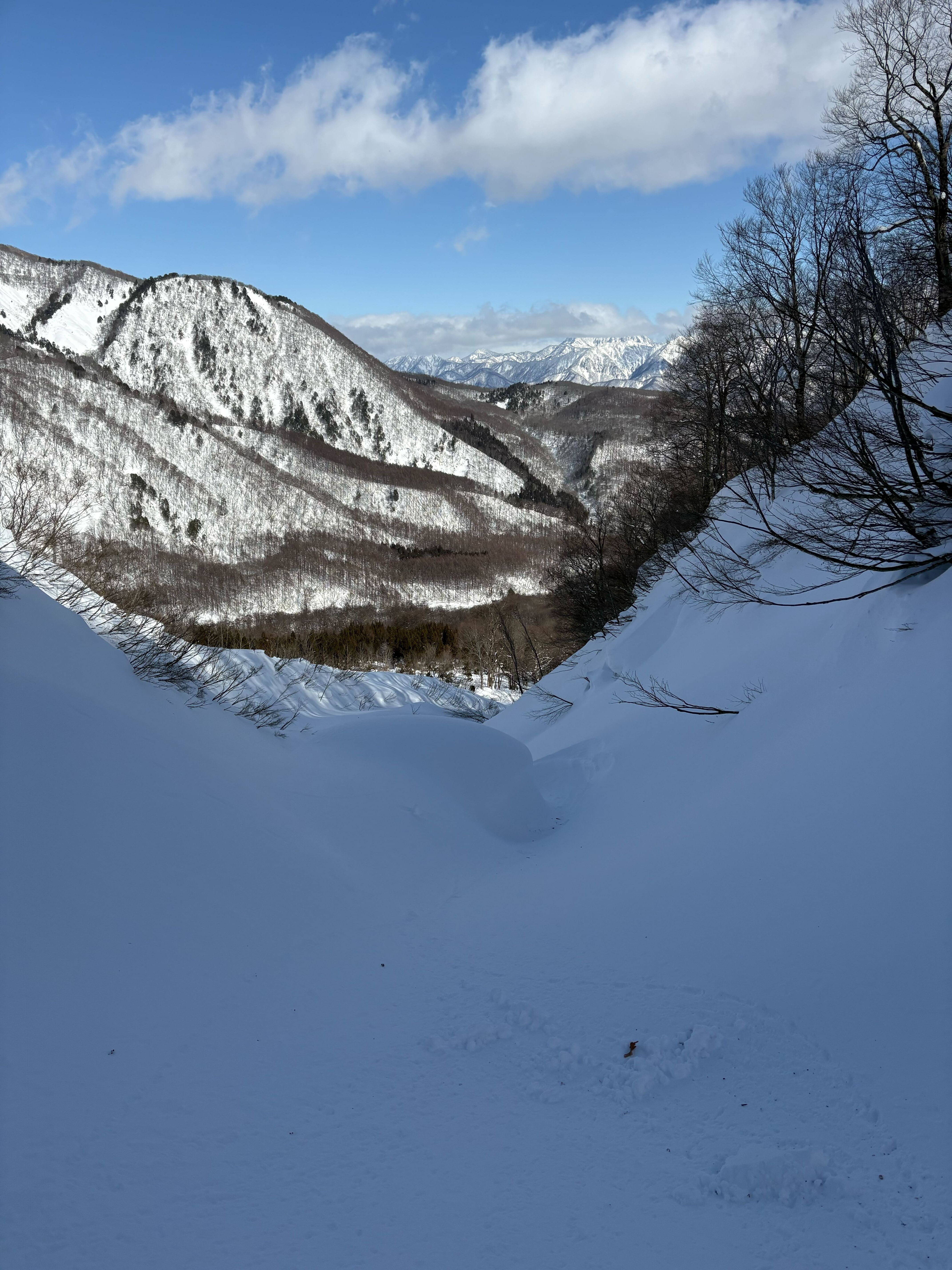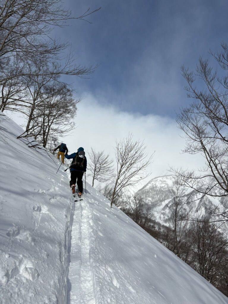 天気は青空が見えたり見えなかったりのちょうど良い感じで、トレースもほぼなく若干のラッセルも交えながら山頂まであがった。沢にドロップし、ふかふかの雪を滑走。慣れない雪質で色々と苦労しながらもなんとか滑り降りて大変でしたが良い一日でした。他メンバの方々の登りや滑り、地形見極めなどとても安定しており、凄いなと思うと同時にとても勉強になりました。