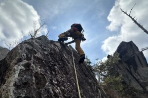 珍しくKenがリードするっていうもんだから…純 5.8を登ってTRのセット。Mika以外の女子はクラック初体験なのでテーピングの巻き方からちゃんと指導して、鬼ころし 5.7あたりをまずは登りこみます。