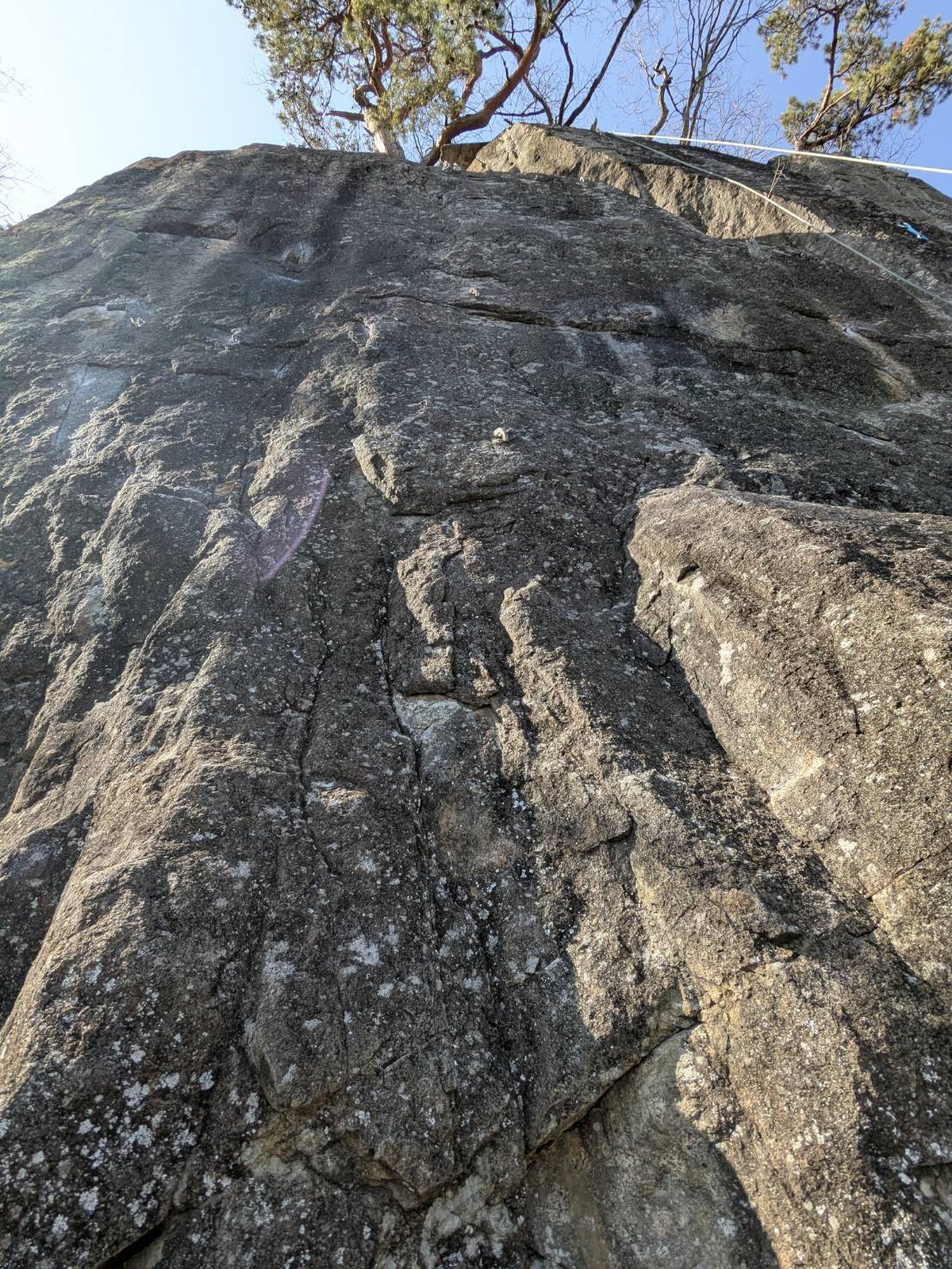 一本目に登ったルートは、クラックがガタツキすぎていて、プロテクションとるのに難儀して、オンサイトならず。各駅停車でプロテクションを取りながら、なんとかトップアウト。