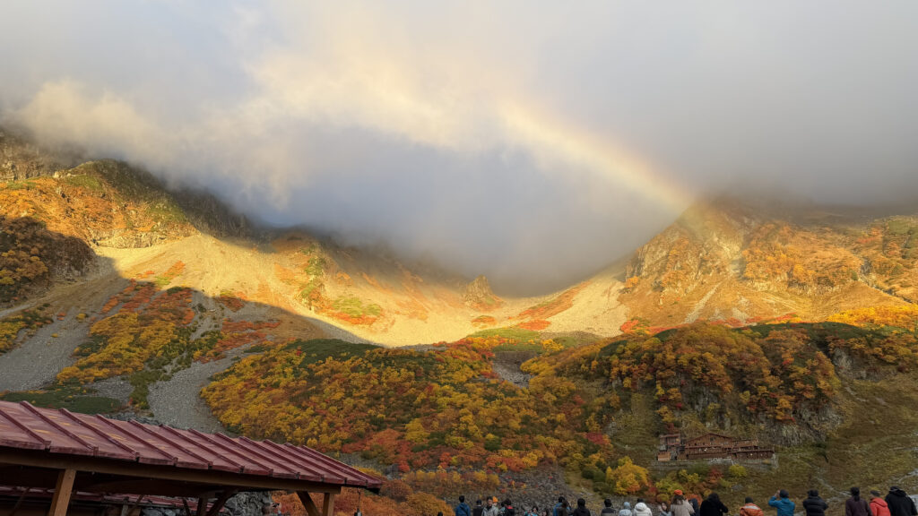 翌朝のモルゲンロートでは上部がガスに隠れてしまっていましたが、そのおかげで虹が出現して幻想的な朝になりました2年越しに最高の涸沢を見せてあげられて本当に良かったです