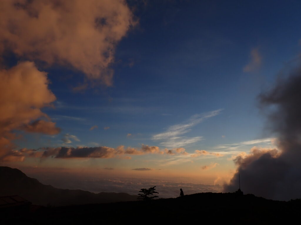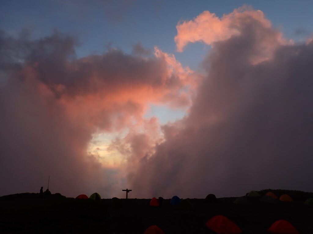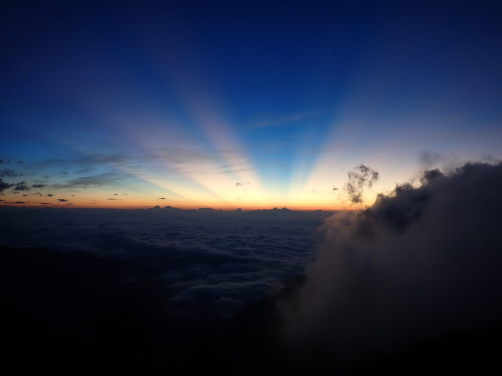 なかなか雲が消えず沈む夕日や昇る朝日を拝むことはできなかったが、明け方の地平線下から伸び広がる光芒は美しかったし、朝陽に映える雲の刻々と変化する様や、安曇野を埋める雲海を堪能することができた。