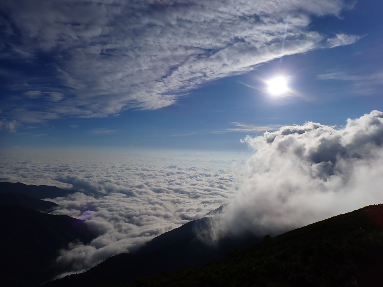 なかなか雲が消えず沈む夕日や昇る朝日を拝むことはできなかったが、明け方の地平線下から伸び広がる光芒は美しかったし、朝陽に映える雲の刻々と変化する様や、安曇野を埋める雲海を堪能することができた。