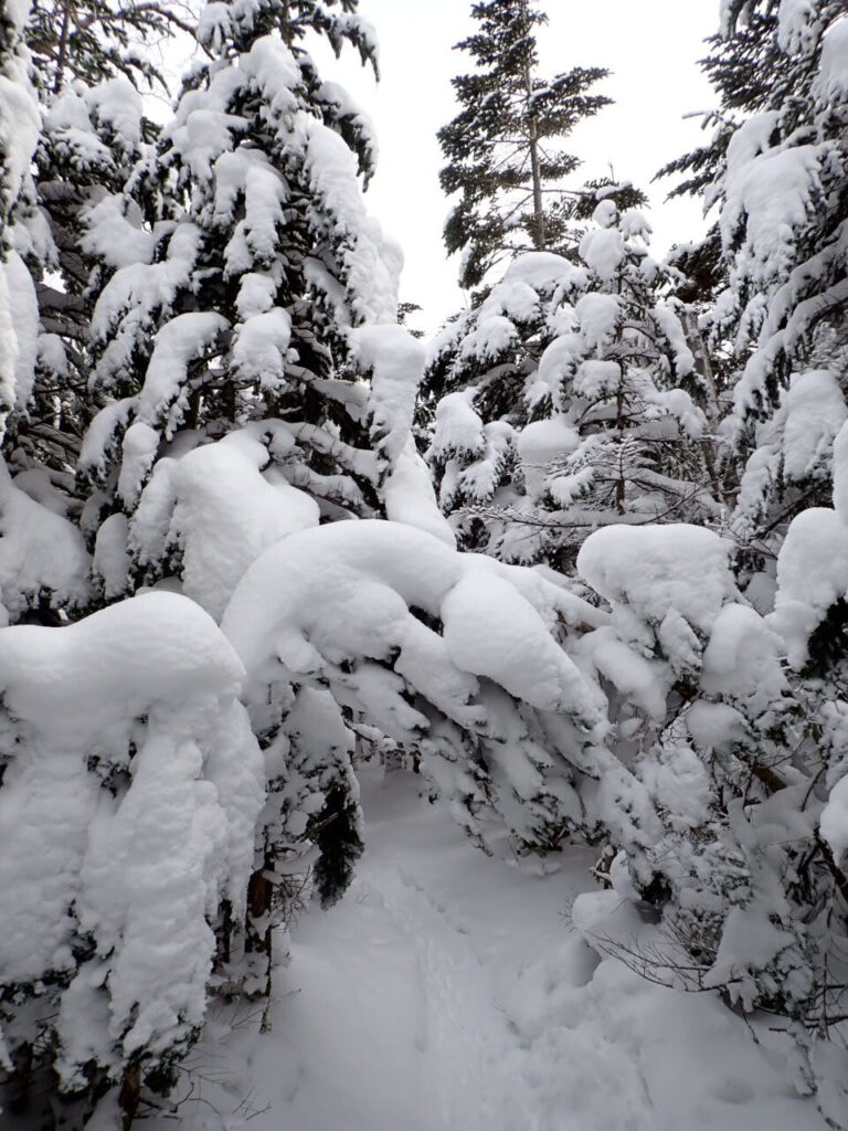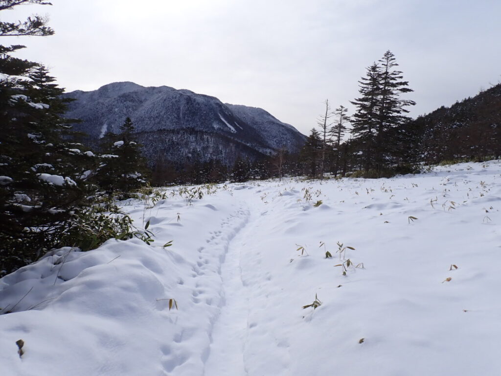 前週末のものとみられるトレースも残っており、吹き溜まった雪やその後の新雪を踏みながら、時に犬や鹿の足跡に導かれながら、時間を気にすることもルート取りに気を遣うこともなく、まさに静かな山旅を味わうことができた。