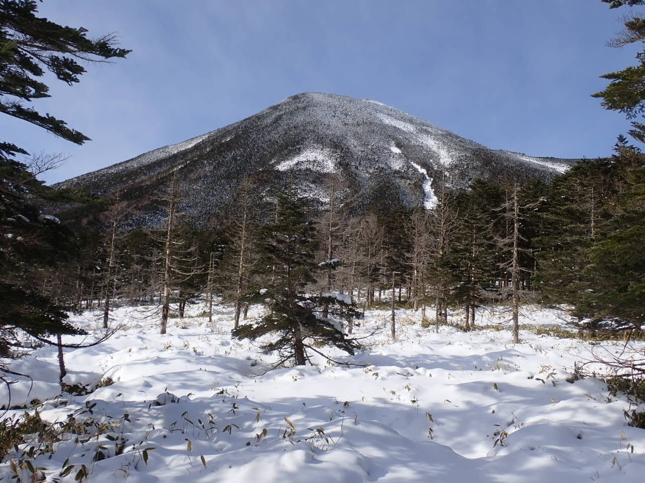 昨日のものとみられるトレースは直接天祥寺原へと下っていたが、時間もあるので大河原峠経由で天祥寺原へ向かうことに。これぞ北八ツという雰囲気を味わいながらのんびりと歩を進める。人影はなく、いつ来ても何度来ても落ち着けるエリアだ。時折振り返り見る蓼科山。