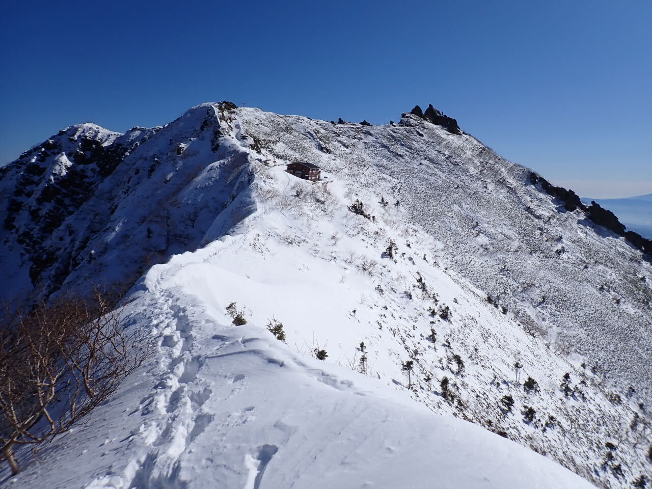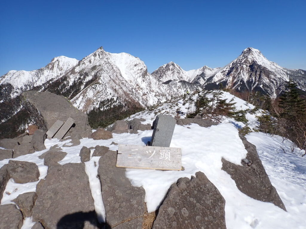 三ツ頭からは南八ツの雄大な眺望が開けるが、この時期としては積雪量は少なく黒っぽい山肌が目立っている。