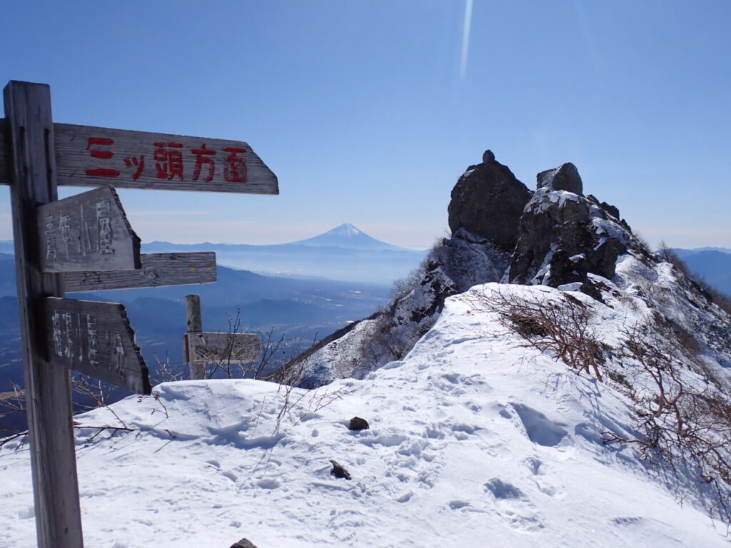 しばらく雪はなかったが、前三ツ頭への急登に差し掛かる地点でチェーンスパイクを装着し、その後アイゼンに履き替えた。